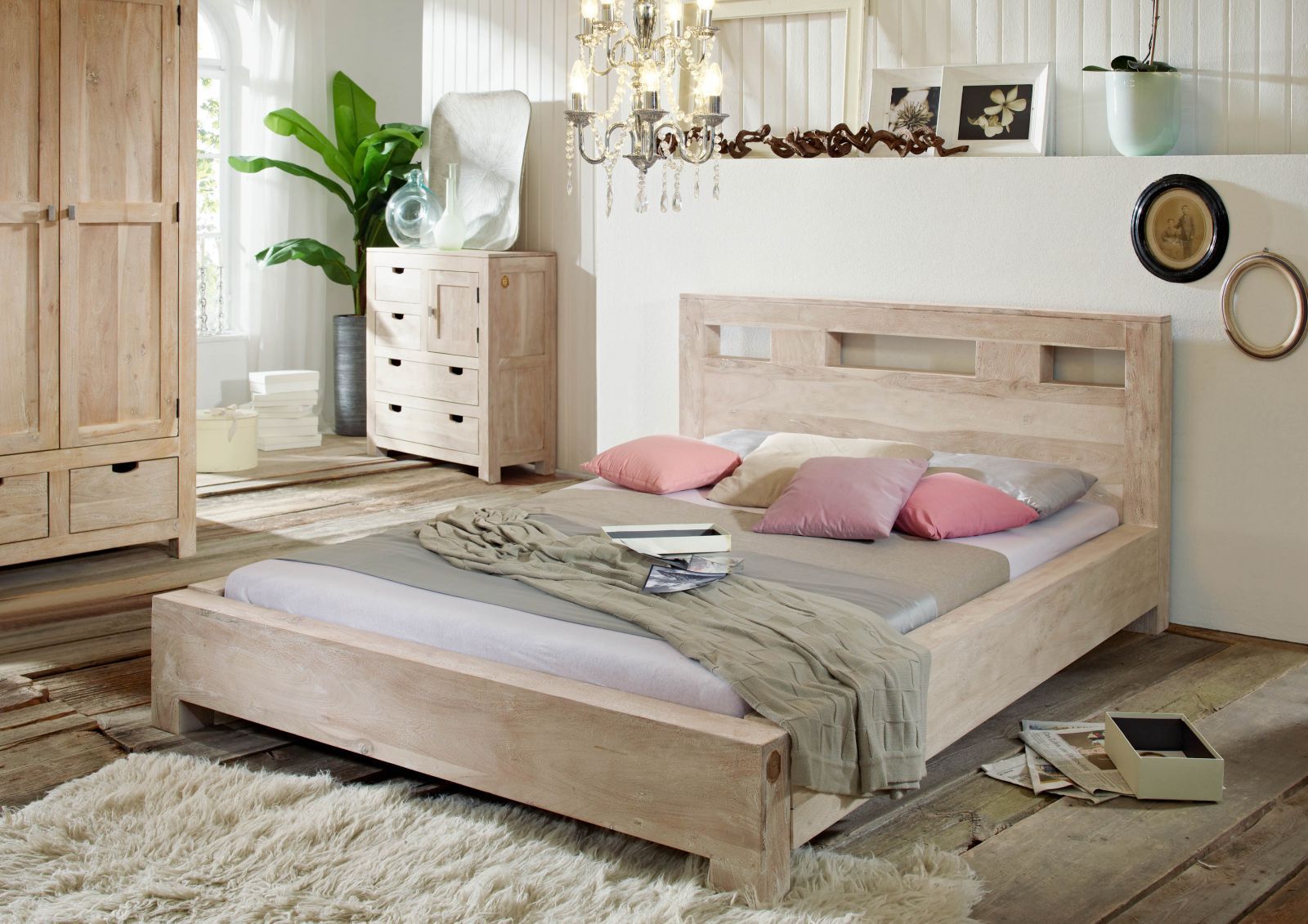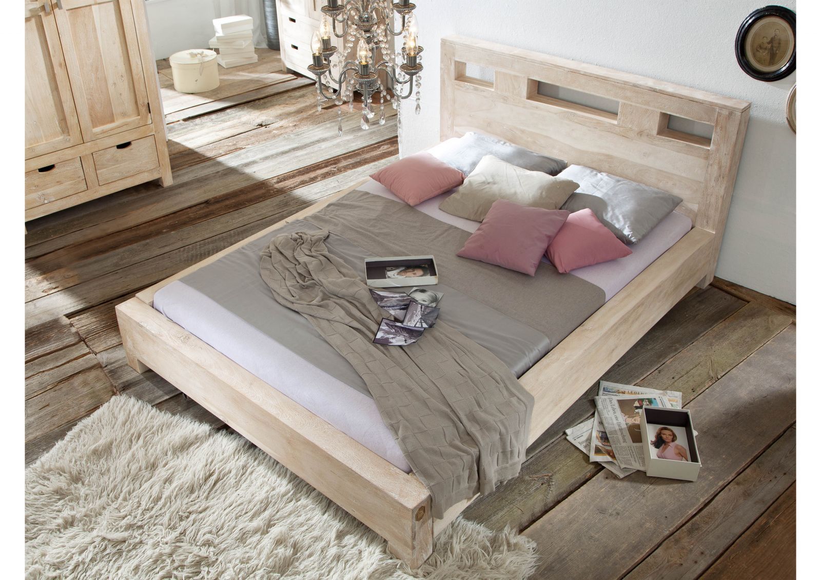 Bett Akazie 140x200x90 white stone getüncht NATURE WHITE