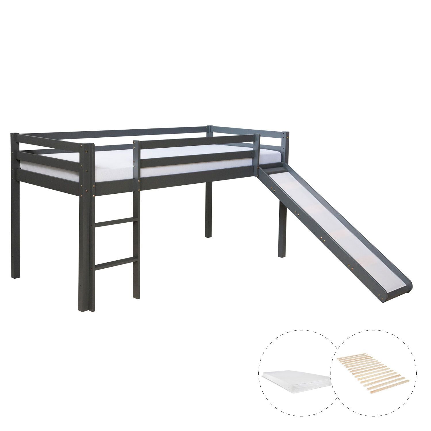 Hochbett Spielbett Kinderbett mit Lattenrost + Matratze & Leiter Rutsche Holz Massiv, Grau - 90x200cm