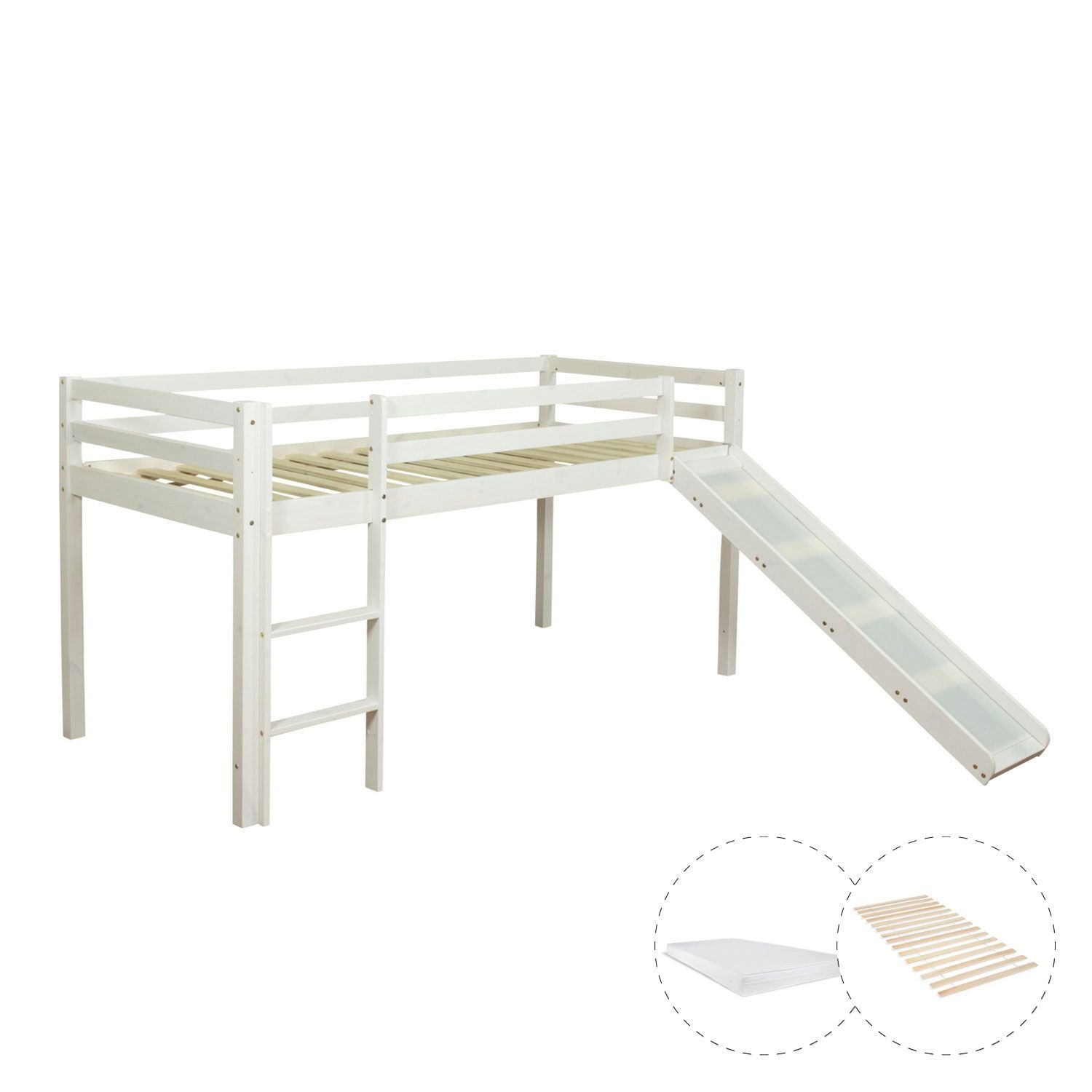 Hochbett Spielbett Kinderbett mit Lattenrost & Matratze + Leiter Rutsche Holz Massiv, Weiss - 90x200cm