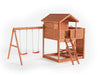 Dieser Spielturm kombiniert Spielturm mit Spielhaus. Der Spielturm verfügt über grosses, zum Teil überdachtes Podes, das über eine Leiter mit Handlauf auf der einen und eine Kletterwand mit Klettersteinen auf der anderen Seite erklommen werden kann. Das 145cm hohe Podest kann optional durch eine Rutsche erweitert werden (nicht im Lieferumfang enthalten). Auf dem Podest befindet sich ein überdachtes Spielhaus mit einer Holztür und einem Fensterausschnitt. -