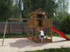 Dieser Spielturm kombiniert Spielturm mit Spielhaus. Der Spielturm verfügt über zwei Podeste, die über eine Leiter auf der einen und eine Kletterwand mit Klettersteinen auf der anderen Seite erklommen werden können. Auf dem Podest befindet sich ein überdachtes Spielhaus mit zwei Eingängen und einem Fensterausschnitt. -