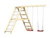 Das Stelzenhaus erhalten Sie mit einem Podest und einer Leiter. Ausserdem enthalten ist eine rote Rutsche mit einer Länge von 2,5m, eine Doppelschaukel mit roten Schaukelsitzen und ein Klettergerüst.