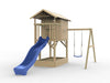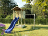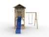 Das Spielhaus wird mit Einzelschaukelanbau inklusive einem blauen Schaukelsitz geliefert. -