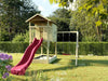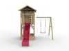 Das Spielhaus wird mit Einzelschaukelanbau inklusive einem pinken Schaukelsitz geliefert. -