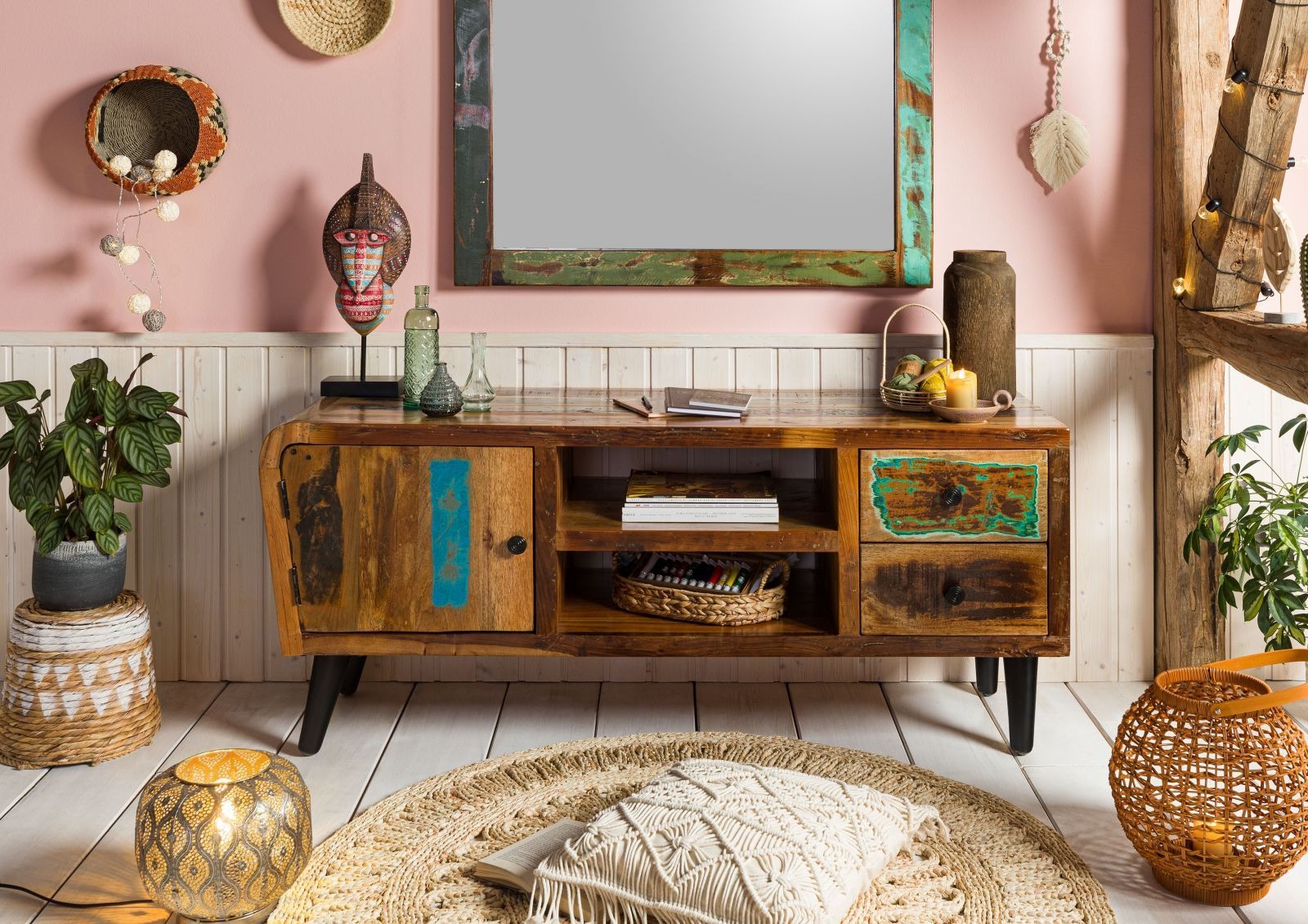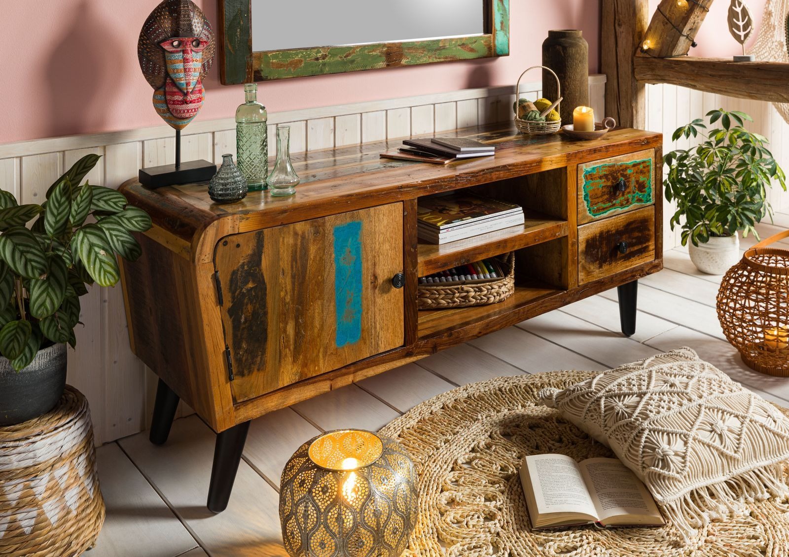 Dabei ist jedes TV-Board ein Unikat: Die Lackierrückstände des Altholzes wurden sorgfältig aufbereitet. Dadurch ziert jeden Schrank ein einzigartiges Farbspiel und kein Möbelstück gleicht damit dem anderen, was für eine aufregende Optik in jedem Wohnraum sorgt. Eine gut durchdachte Aufteilung des Boards in zwei Schubladen, zwei offene Fächer und einer Tür halten dazu ausreichend Platz für Receiver, Blu-ray-Player und Co. bereit.