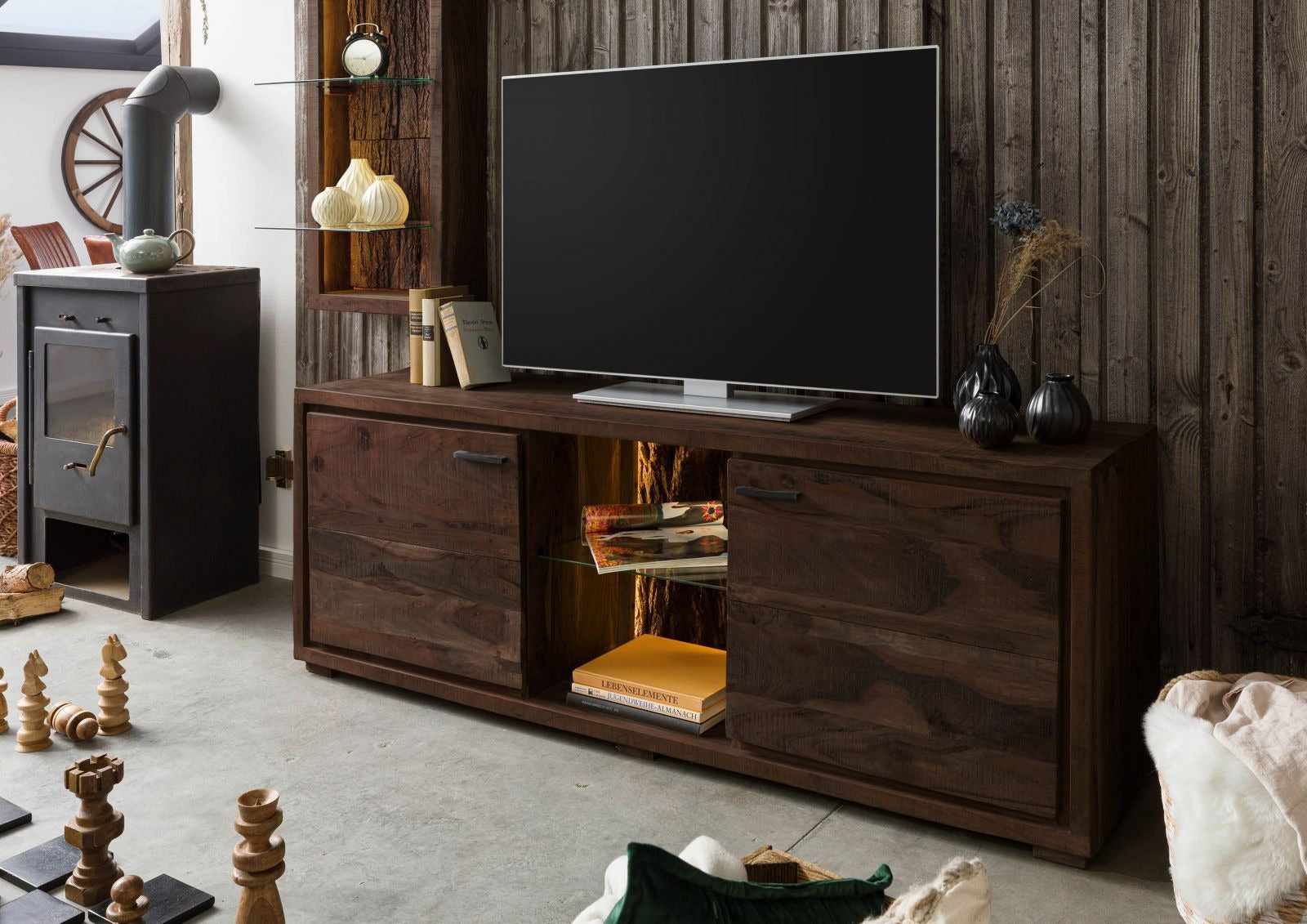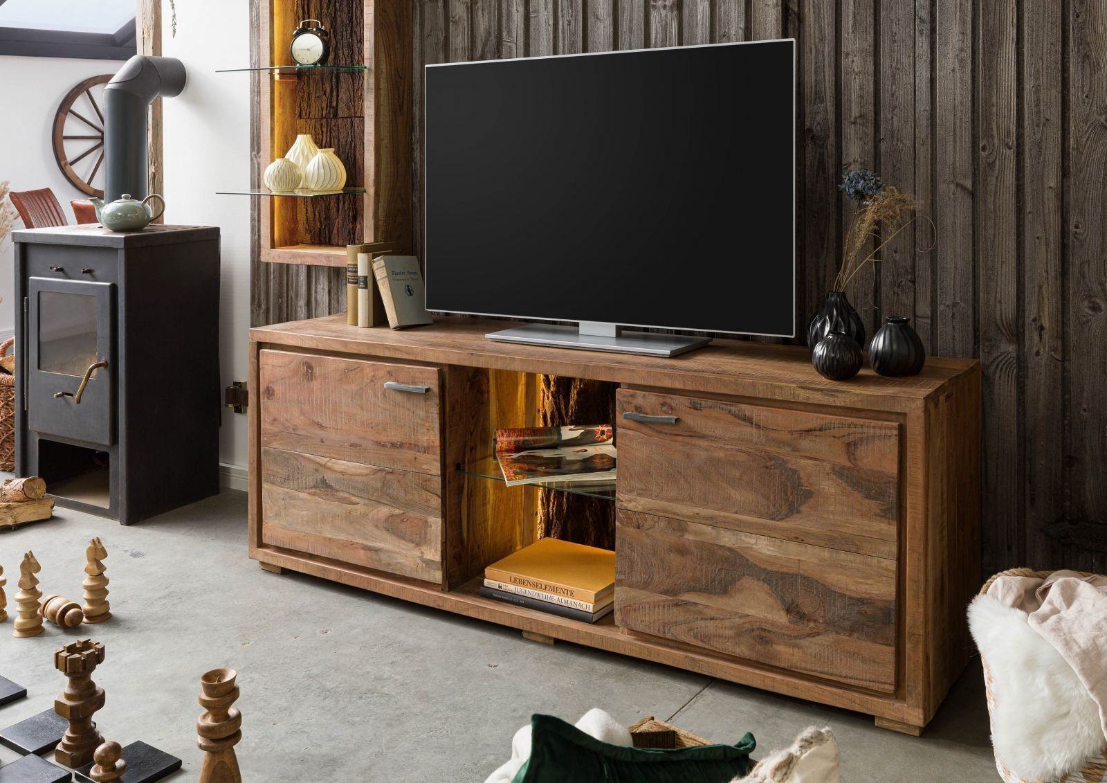 In Sachen Funktionalität überzeugt das TV-Board ebenfalls: Hinter zwei Türen aus lackiertem Akazienholz befindet sich jede Menge Stauraum für alles, was unweit des Fernsehers nicht fehlen darf. An den Türen ist der Hobelschlag sichtbar, was dem Möbelstück eine handwerkliche Note verleiht. Stellfläche für den TV bietet sich oben auf dem TV-Rack.