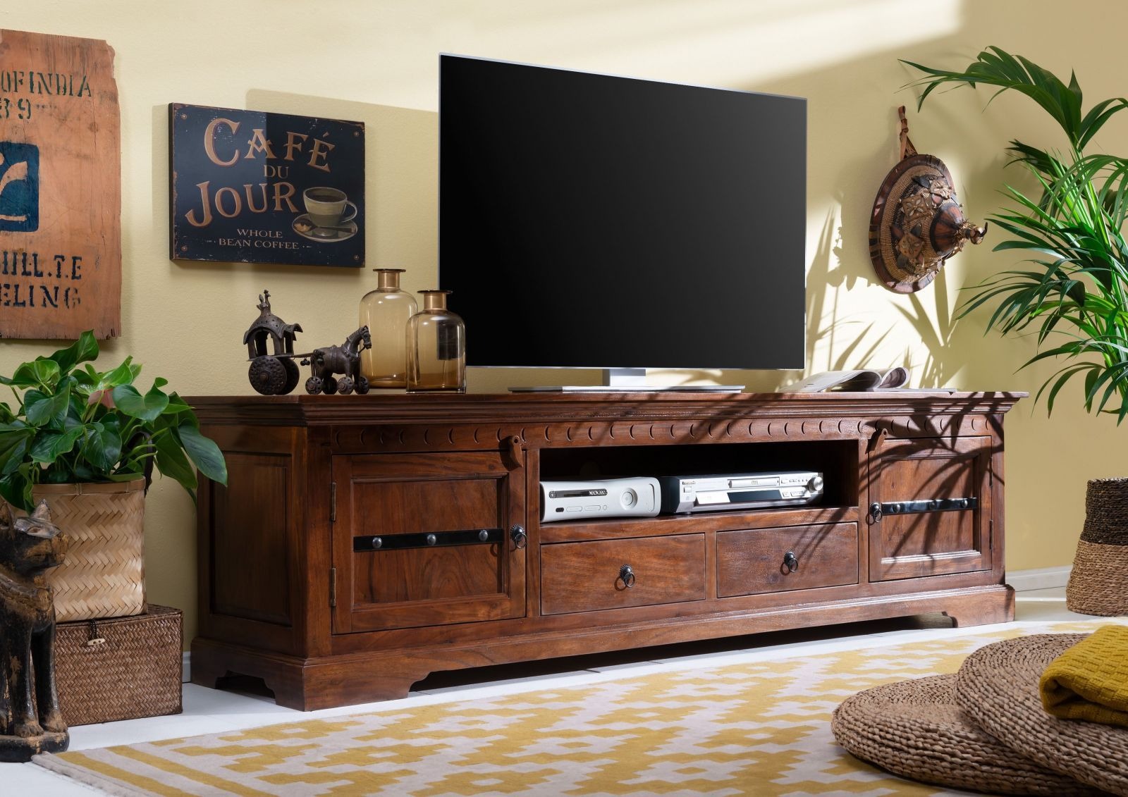 - TV-Lowboard aus dunklem Akazienholz im historischen Kolonialstil