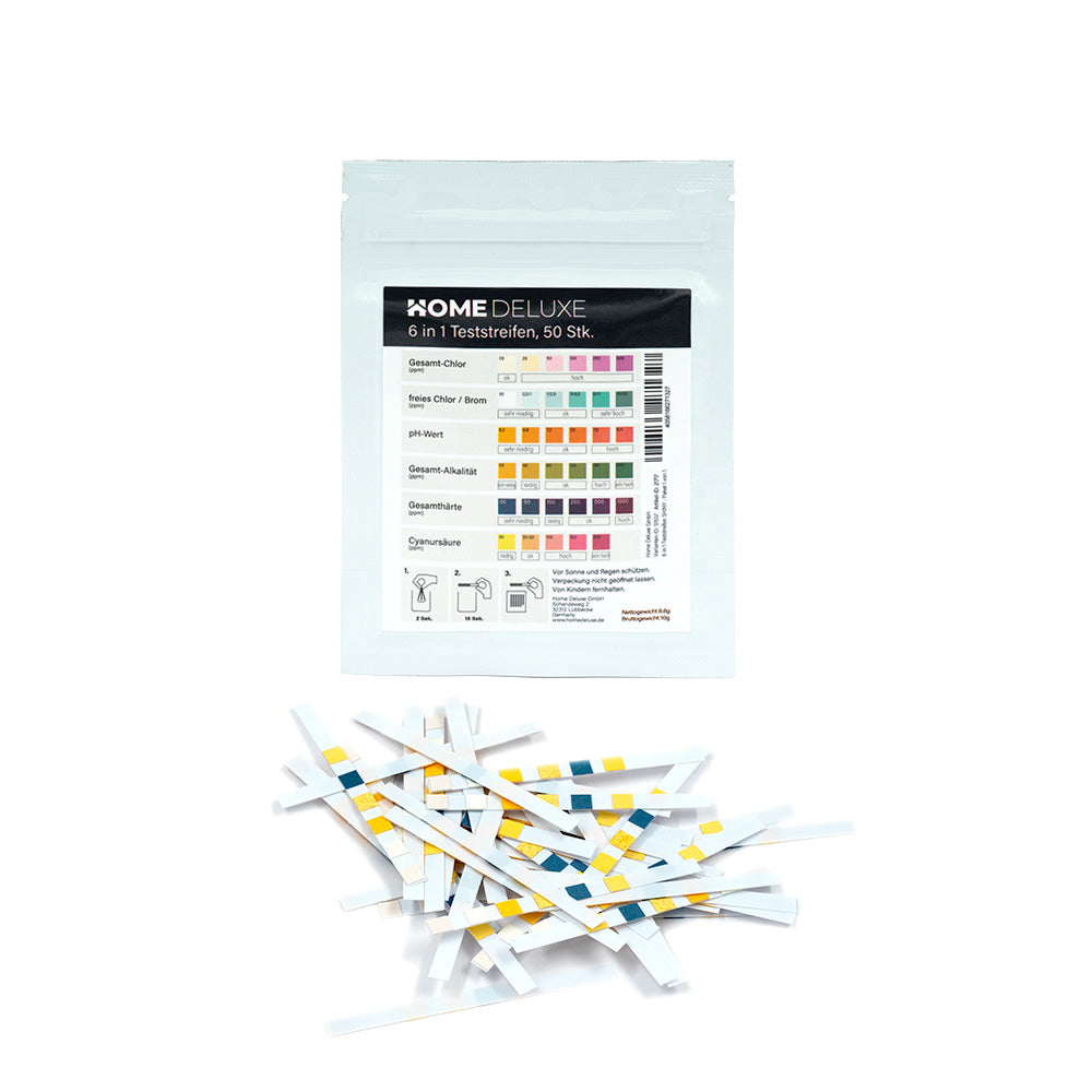 - 50 x Teststreifen für pH-Wert, Gesamt-Chlor, freies Chlor/Brom, Gesamt-Alkalinität, Cyanursäure, Gesamthärte