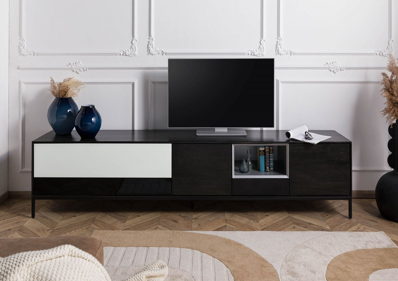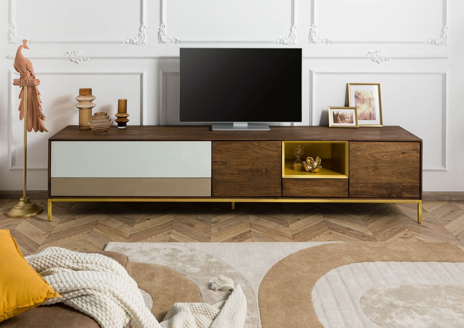 Un mélange extraordinaire de formes classiques et de design moderne : ce meuble TV en bois de manguier massif impressionne par son minimalisme stylistique associé à des détails élégants. Il s'agit notamment des façades en verre clair et foncé des deux tiroirs ou des bordures métalliques du compartiment ouvert. Les pieds étroits prolongent habilement la silhouette droite du buffet.