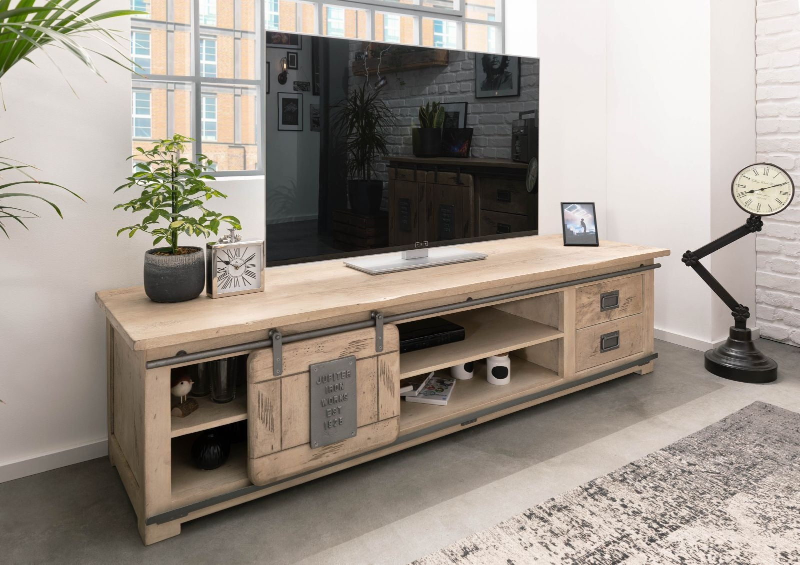 Ce meuble TV de la série RAILWAY attire le regard dans chaque salon. Parce que le banc TV en bois massif n'impressionne pas seulement visuellement, le meuble se caractérise également par ses propriétés fonctionnelles. Le meuble téléviseur contient deux grands tiroirs et de nombreux compartiments ouverts. Un évidement à l'arrière permet de placer et de connecter facilement des récepteurs, des lecteurs DVD ou des consoles.