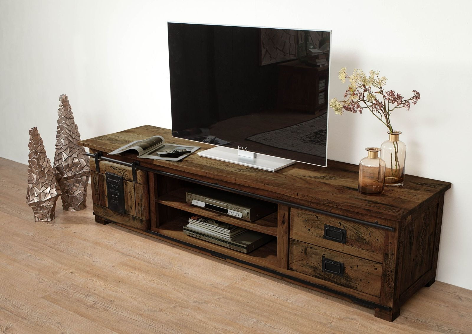 Le look est caractéristique : le tableau TV a un style industriel très tendance. Les éléments caractéristiques en sont, entre autres, les éléments en fer léger qui n'ornent pas seulement les tiroirs. Une longue barre de fer est également montée sur la façade du meuble. Une porte coulissante peut toujours être positionnée différemment et crée de nouveaux effets visuels. Le style est complété par le bois de manguier, qui est relooké dans un aspect usé et présente une structure unique.