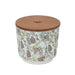 La bougie à motifs possède trois mèches et est présentée dans un récipient en mélamine avec un couvercle en bambou. Le récipient est imprimé avec le motif correspondant du parfum et peut être utilisé une fois la bougie éteinte.