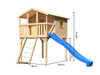 Maison sur pilotis 'BEN' naturel avec rampe en filet et toboggan bleu, 198x244x309cm (LxPxH)