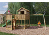 I 6 ancoraggi necessari per fissare la torre da gioco al suolo e le 6 maniglie sono già compresi nella fornitura. La palafitta è dotata tutt'intorno di un parapetto alto 60 cm. La scala è dotata di pioli metallici arrotondati e quindi riduce al minimo il rischio di schegge di legno e spigoli vivi. La casetta viene fornita anche con tappi di copertura per i collegamenti a vite.Pretrattato