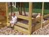 Questa torre da gioco combina una torre da gioco con una casa da gioco. La torre dei giochi è dotata di una piattaforma in due parti su cui è possibile salire tramite una scala da un lato e di una parete da arrampicata con pietre da arrampicata dall'altro lato. Sul podio c'è un teatro coperto con una finestra ritagliata.incl. tavolo da picnic e sabbiera
