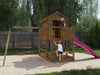 I 6 ancoraggi necessari per fissare la torre da gioco al suolo e le 6 maniglie sono già compresi nella fornitura. La palafitta è dotata tutt'intorno di un parapetto alto 60 cm. La scala è dotata di pioli metallici arrotondati e quindi riduce al minimo il rischio di schegge di legno e spigoli vivi. La casetta viene fornita anche con tappi di copertura per i collegamenti a vite -