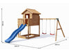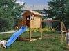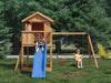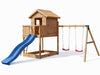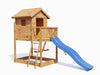 Spielturm 'UNIVERSE S' teakfarben inkl. Doppelschaukel & Rutsche Blau, 400x489x280cm (BxTxH)