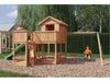 Dieser Spielturm kombiniert Spielturm mit Spielhaus. Der Spielturm verfügt über ein zweiteiliges Podest, das über eine Leiter auf der einen und eine Kletterwand mit Klettersteinen auf der anderen Seite erklommen werden kann. Auf dem Podest befindet sich ein überdachtes Spielhaus mit einem Fensterausschnitt. -