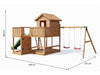 Spielturm mit Doppelschaukel, Kletterwand, Picknicktisch, Sandkasten und Rutsche